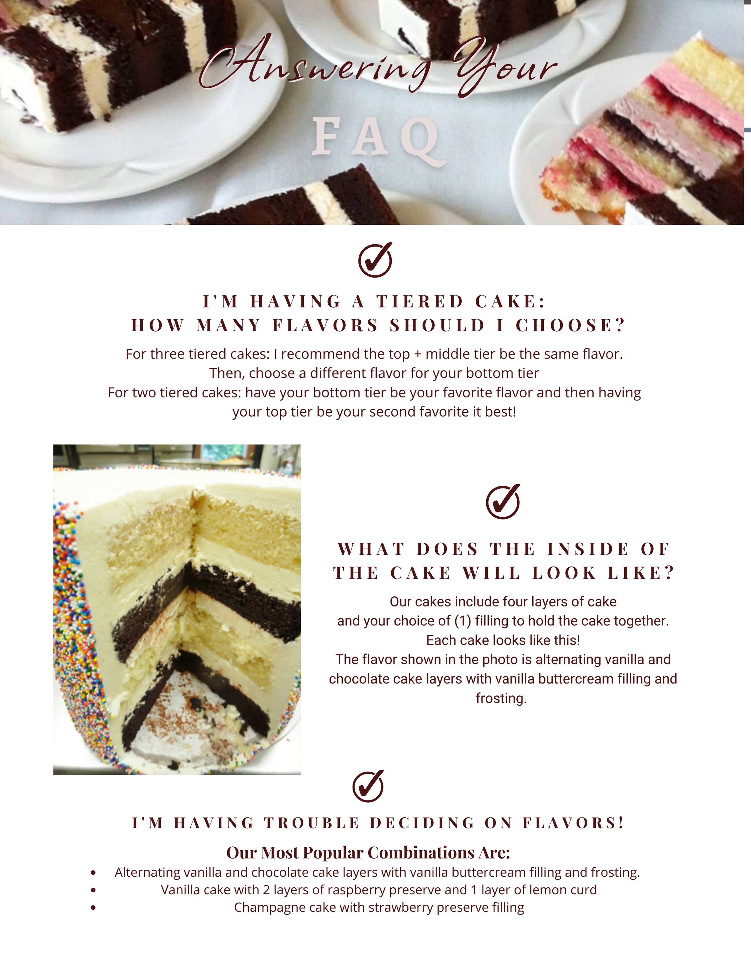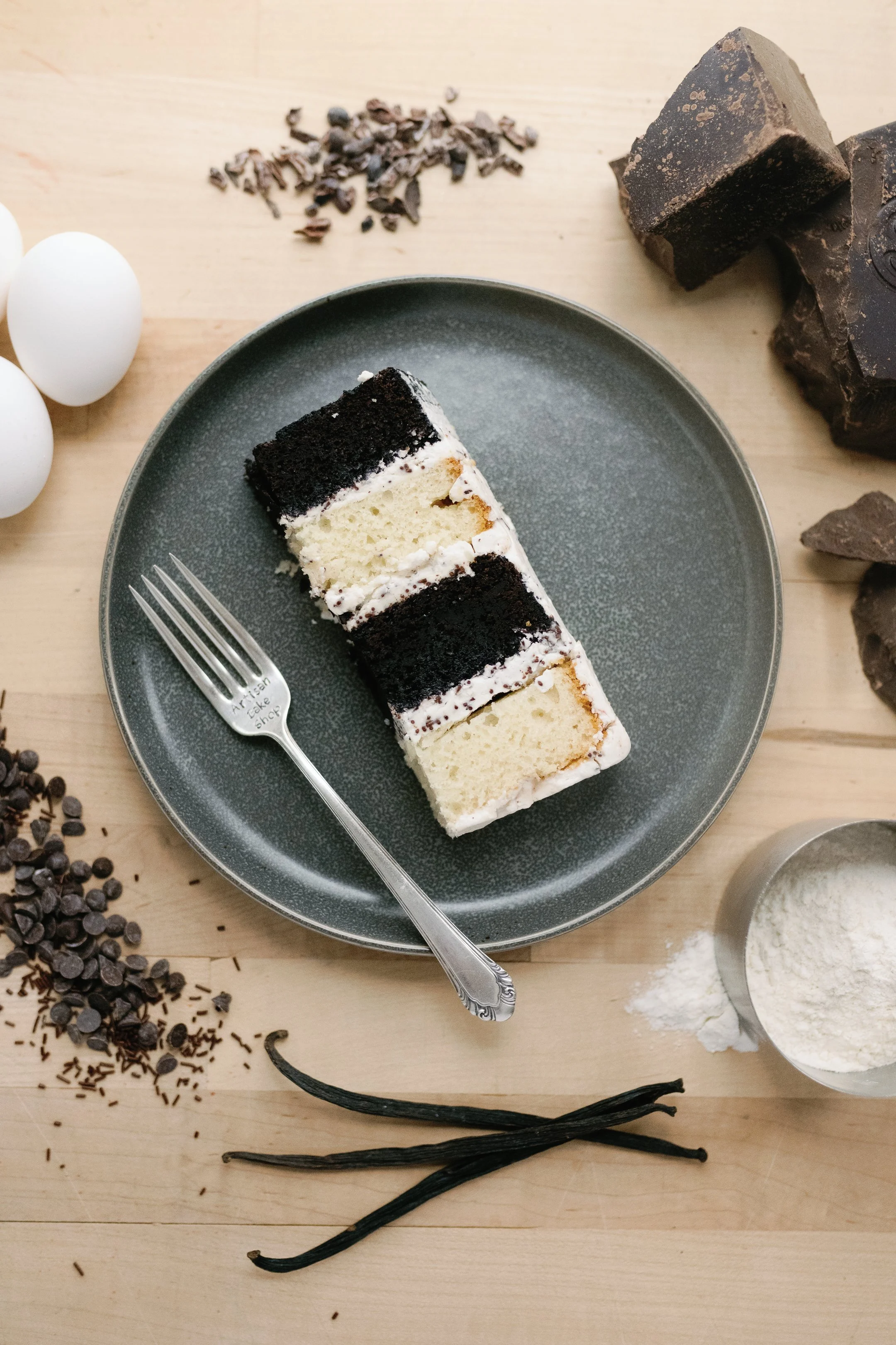 -Vanilla Cake and Chocolate Alternating Layers (almost like a marble or checkerboard) with Vanilla Buttercream Filling